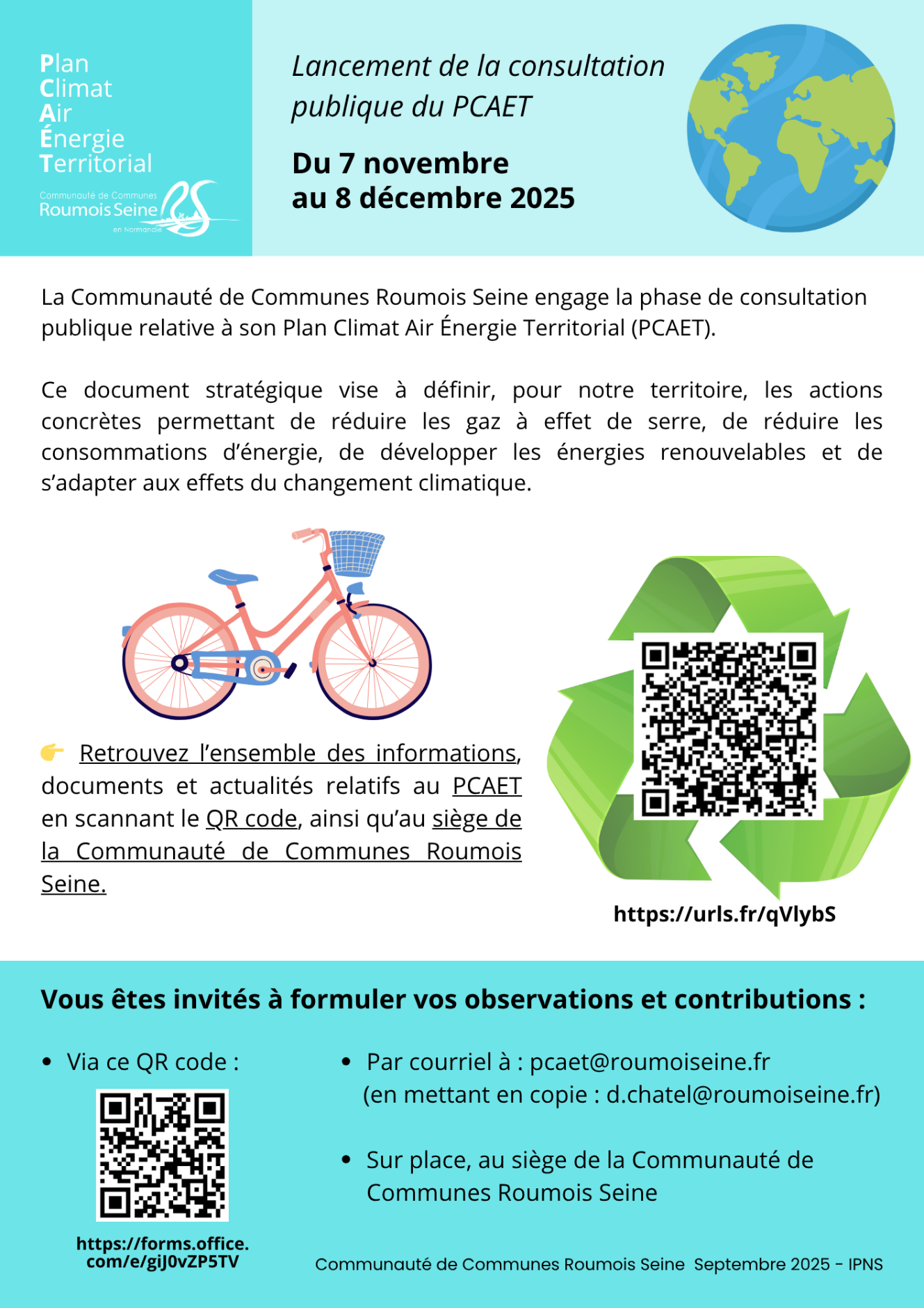 Dans le cadre d’une consultation publique Plan Climat Air Énergie Territorial (PCAET) qui se tiendra du 07 novembre au 08 décembre 2025 la communauté de communes vise à définir un document stratégique pour le territoire permettant de réduire les gaz à effet de serre, réduire la consommation d’énergie, de développer les énergies renouvelables et de s’adapter aux effets du changement climatique.
